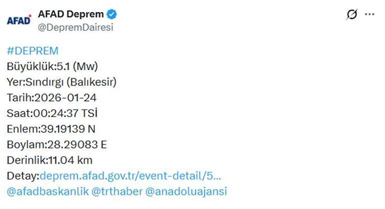 Afet ve Acil Durum Yönetimi Başkanlığı (AFAD) tarafından yapılan açıklamalara göre, Balıkesir’in Sındırgı ilçesinde saat 00.24’te 5.1 büyüklüğünde bir deprem meydana geldi. Bu depremin derinliği ise 11.04 kilometre olarak kaydedildi. Sarsıntı, İstanbul ve çevresindeki illerde de hissedildi.